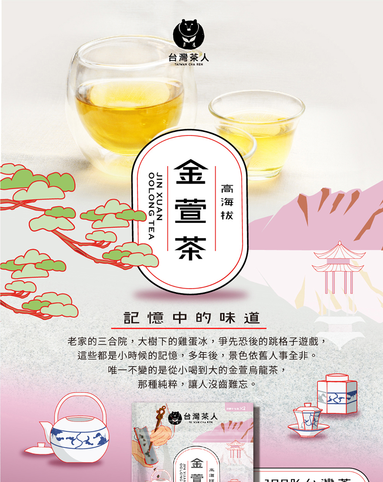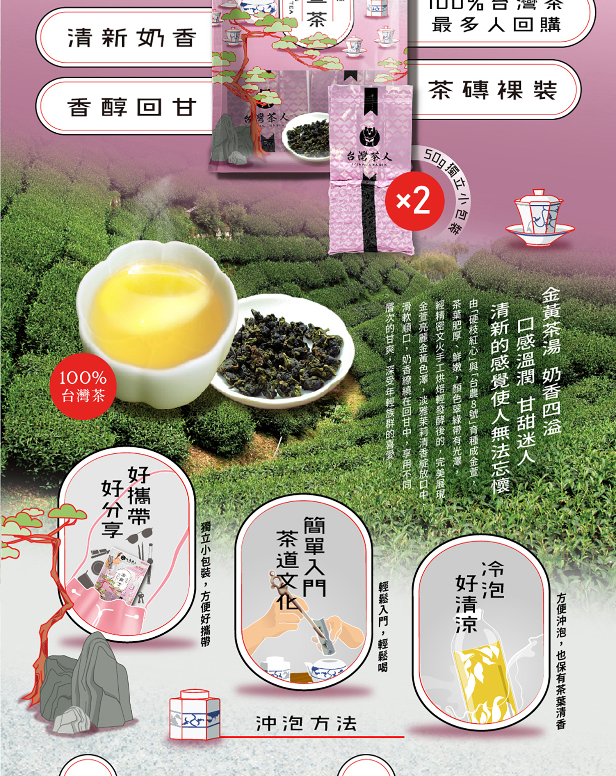 由「硬枝紅心」與「台農8號」育種成金萱、茶葉肥厚、鮮嫩,顏色翠綠帶有光澤,經精密文火烘焙輕發酵後,完美展現金萱亮麗金黃色澤,淡雅茉莉香綻放口中,享用不同層次的甘爽,深受年輕族群的喜愛。