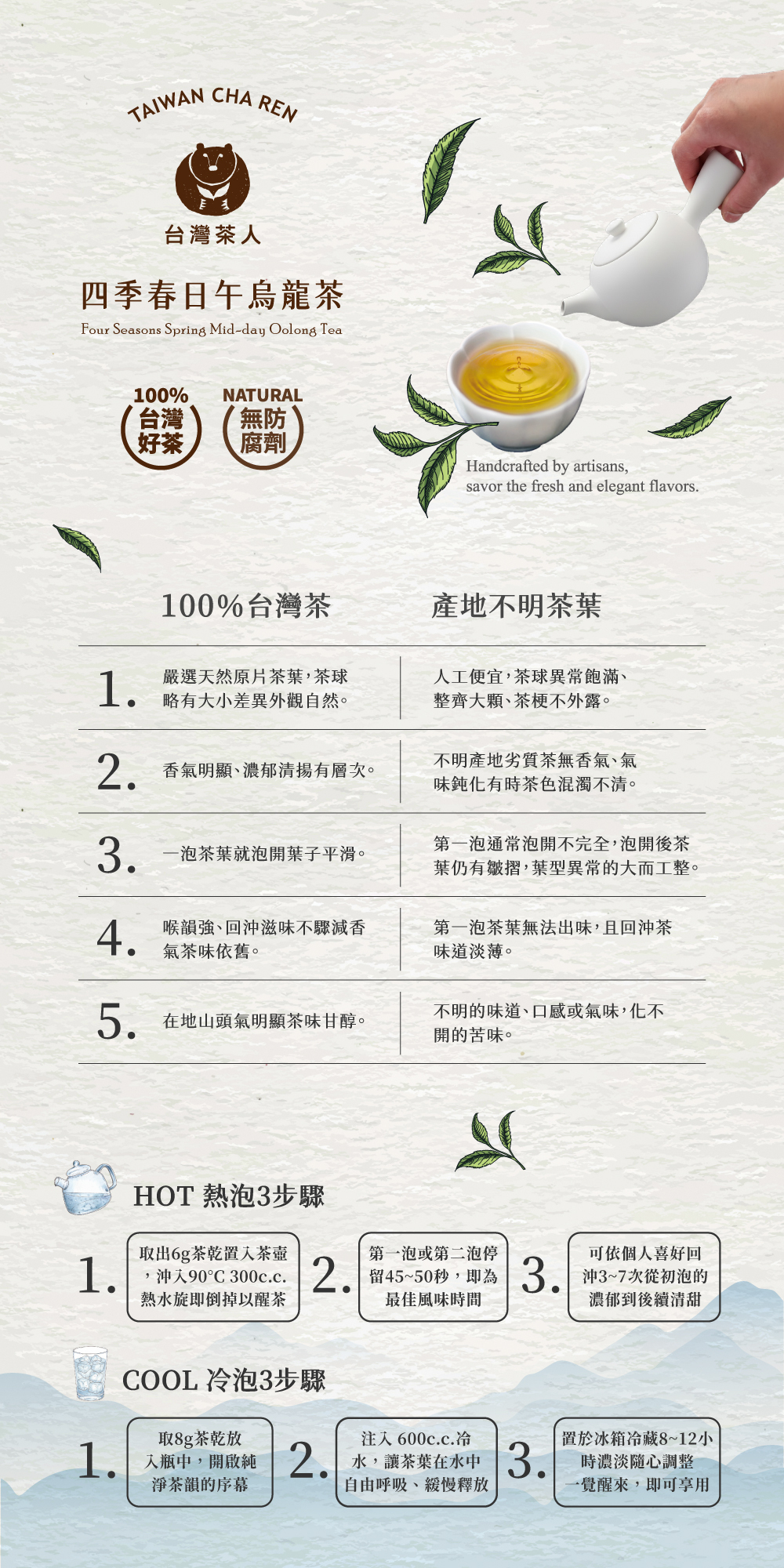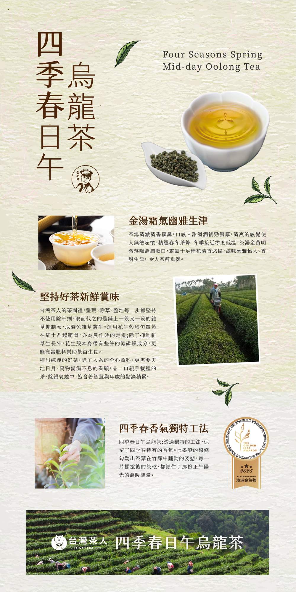 四季春日午烏龍茶:透過獨特的工法,保留了四季春特有的香氣。水墨般的線條勾勒出茶葉在竹篩中翻動的姿態,每一片揉捻後的茶乾,都鎖住了那份正午陽光的溫暖能量。