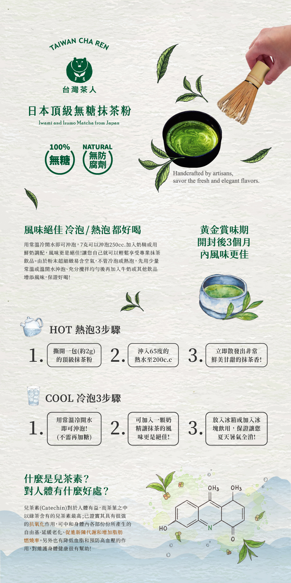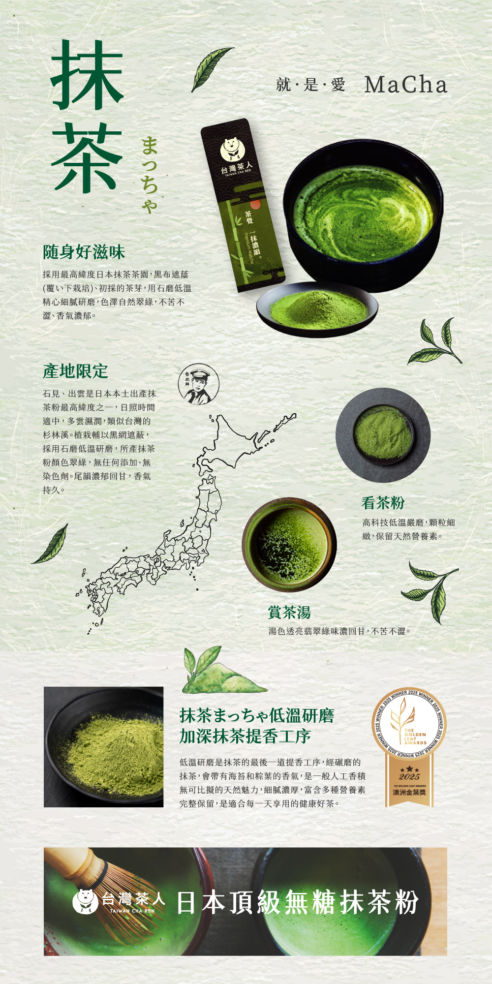 ✦採用最高緯度日本出雲抹茶茶園,黑布遮蔭(覆い下栽培)、初採的茶芽,用石磨低溫精心細膩研磨,色澤自然翠綠,不苦不澀、香氣濃郁。